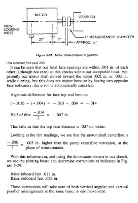All of the foregoing refers of course to bracket sag. In long machines, we will also have shaft sag. This is mentioned only in passing, since there is no need to do anything about it at this time. Our “point-by-point” alignment will automatically take care of shaft sag. For initial leveling of large turbogenerators, etc., especially if using precision optical equipment, shaft sag must be considered. Manufacturers of such machines know this, and provide their erectors with suitable data for sag compensation. Further discussion of shaft sag is beyond the scope of this text.